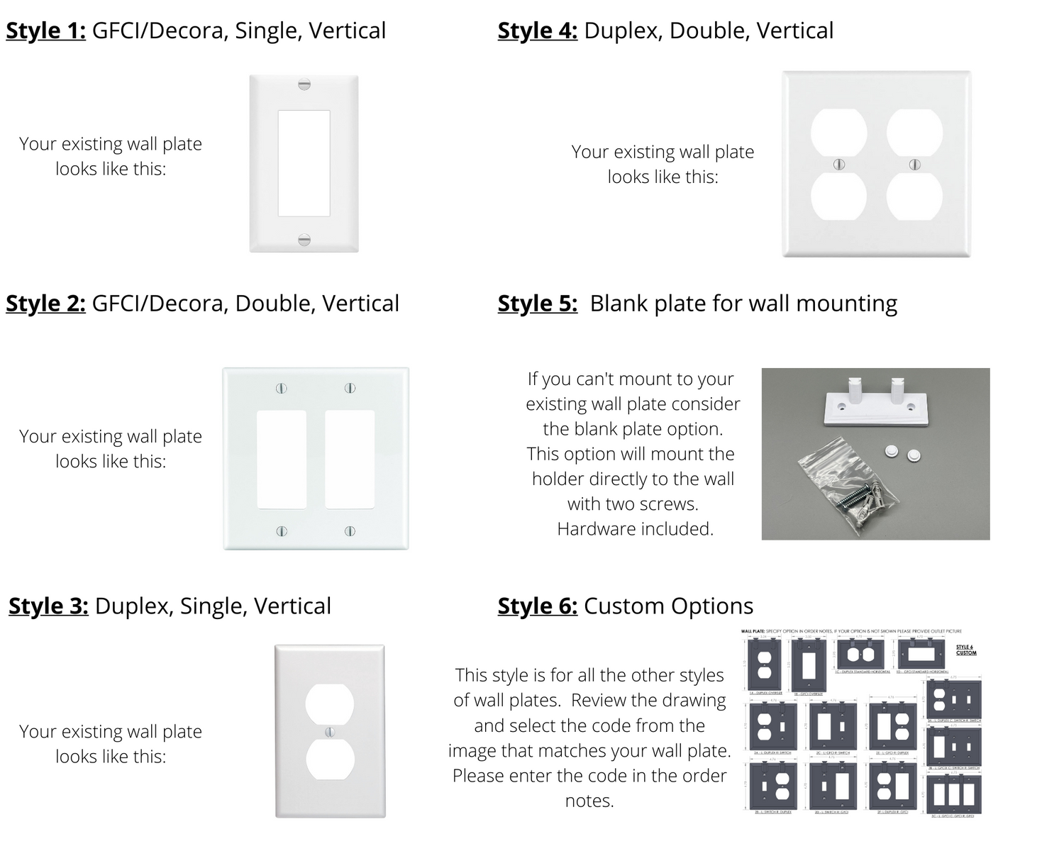 For wall outlet mount styles the next step is to determinw which Style is needed. There are 6 Styles based upon what type of wall plate you have on the outlet where you plan to install the holder. Styles 1-5 are the most popular options. The Style 6 drawing has further Styles to choose from, please just include the Style option from the drawing in the listing with this option.